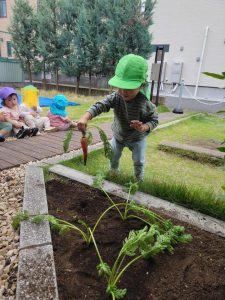 5月の食育🥕 2025年10月23日 / wpmaster / コメントする 5月の食育で、オイシックスさんから立派な葉付きの人参が届きました✨子ども達より先生が大喜び😆それは立派な🥕だったんですもの。早速庭の花壇の隅に埋めて、人参の食育スタート!!最後に1人1人、人参をなんちゃって収穫して大満足の一日になりました🤗